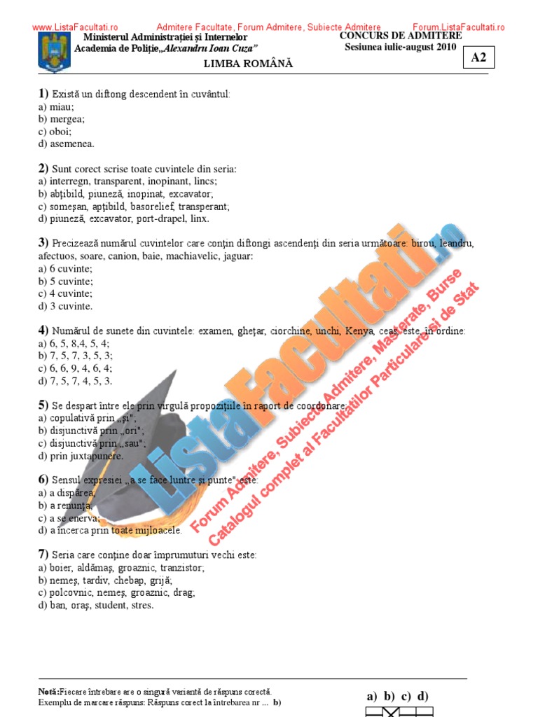 Listafacultati Ro Subiecte Admitere Academia Politie 2010 Romana V2