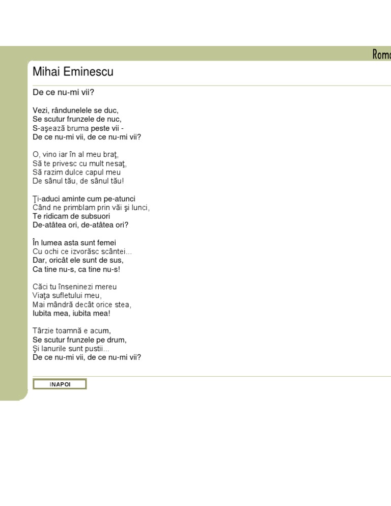 De Ce Nu Mi Vii De Mihai Eminescu