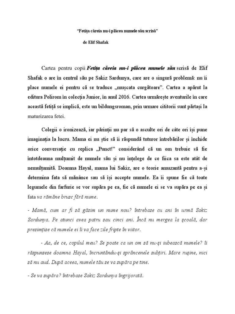școlărel De Clasa A V A Fetița Căreia Nu I Plăcea Numele Său De Elif Shafak Machete Didactice