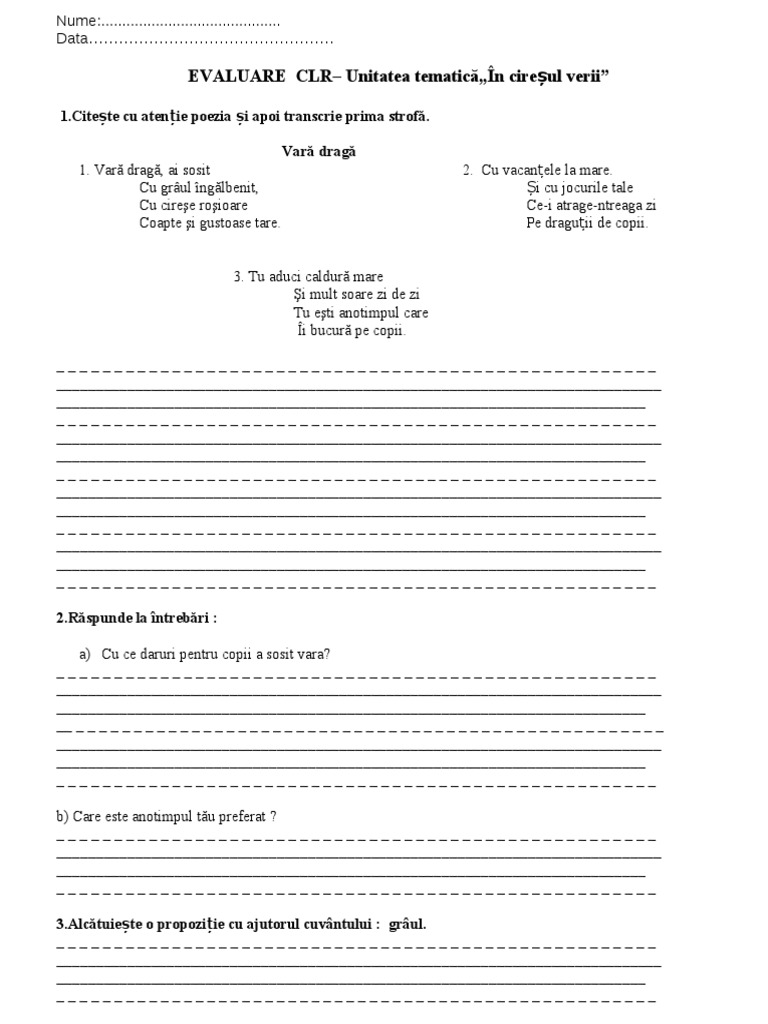 Test De Evaluare Finală La Limba Romană Clasa A Iii A Popa Luminita 29 05 2012 Romanian Language Homework Sheet School