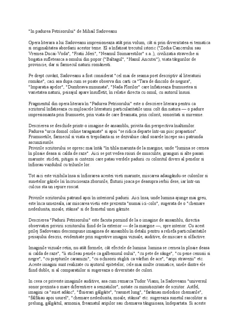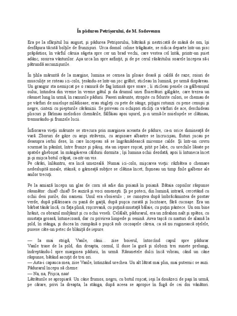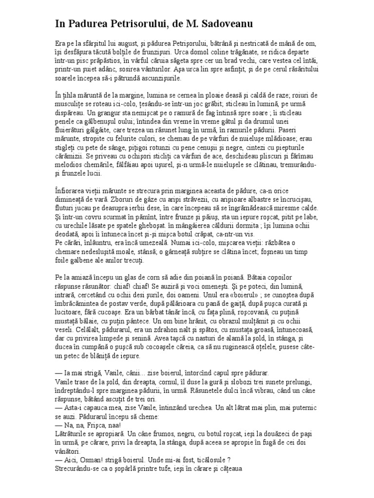 Fișă De Lectură In Pădurea Petrișorului De Mihail Sadoveanu