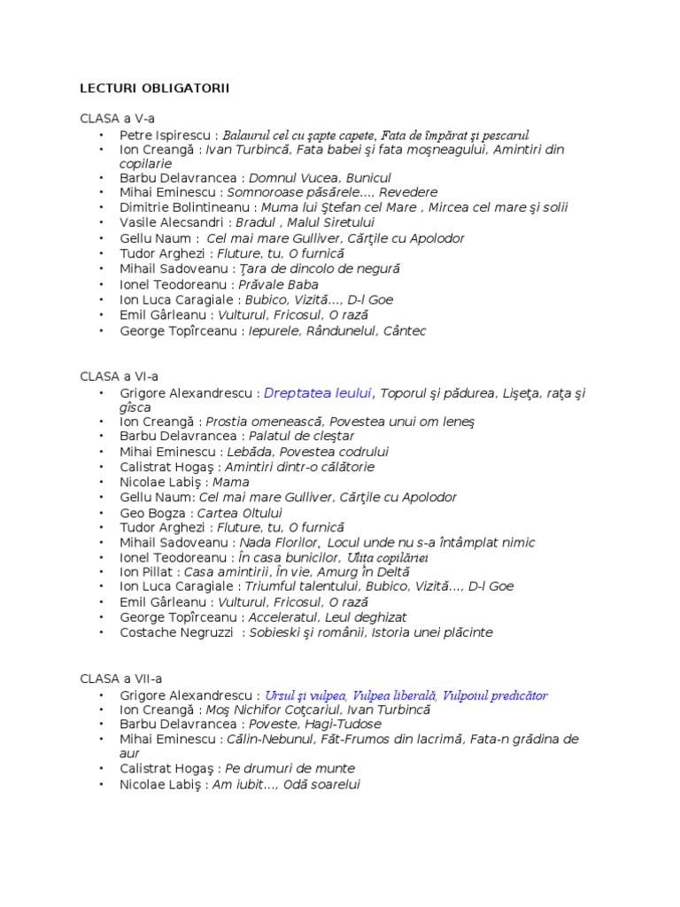 Lista De Lecturi Obligatorii Pentru Clasa A Va