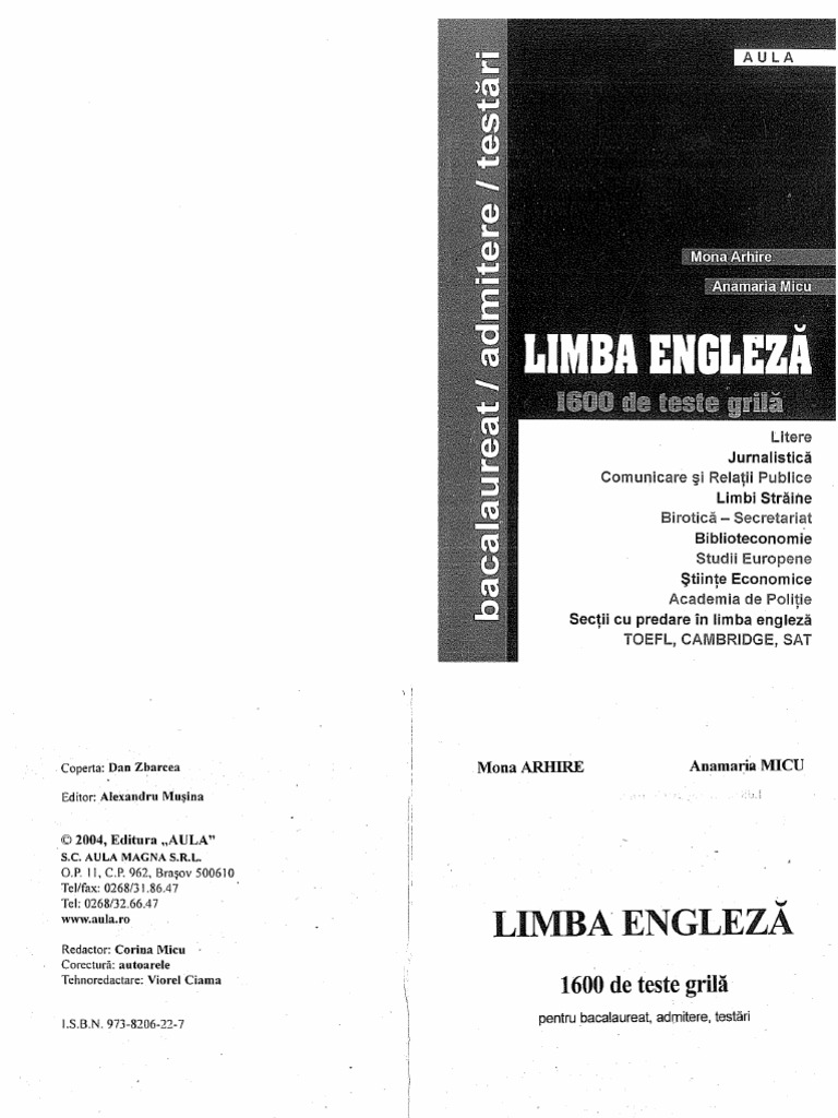 1600 de teste grilă pentru bacalaureat admitere testări mona arhire anamaria micu loc publicare. Alte carti din colectia academica 10. Poti alege să urmezi cursurile de limba engleza pentru adolescenti propuse de noi pe timp de zi sau seara precum si în weekend cu program de o oră şi jumatate de două ori pe saptamana. Contributii la istoria spatiului romanesc in perioada migratiilor si evul mediu timpuriu 2005.