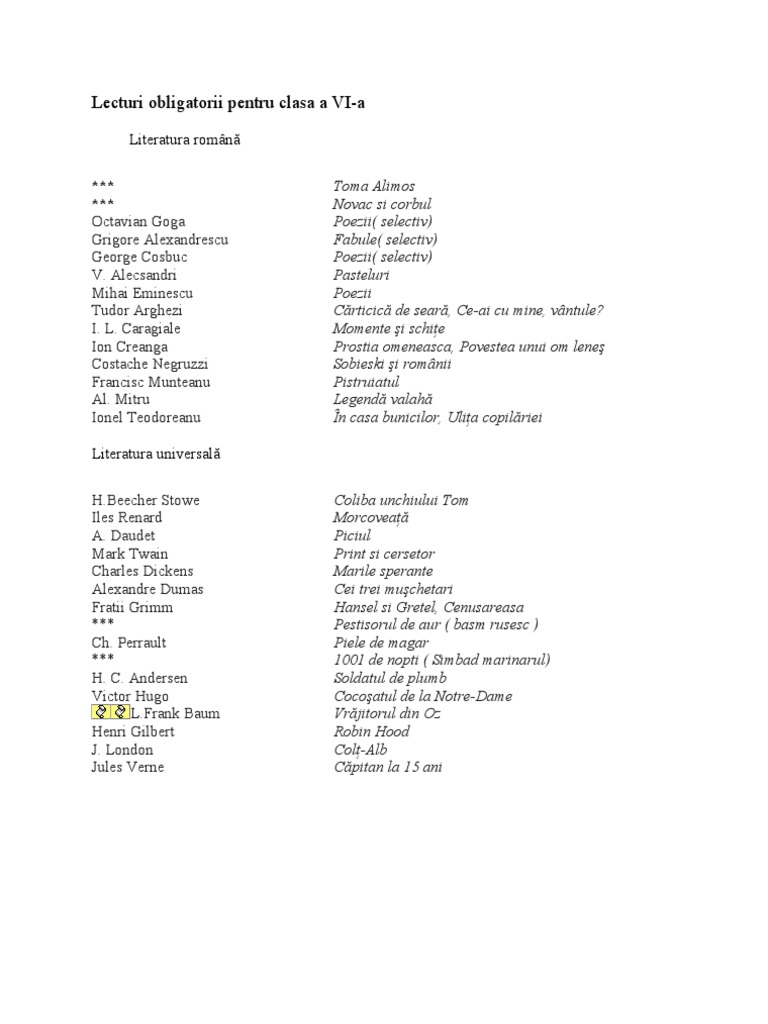 Lecturi Obligatorii Pentru Clasa A Vi