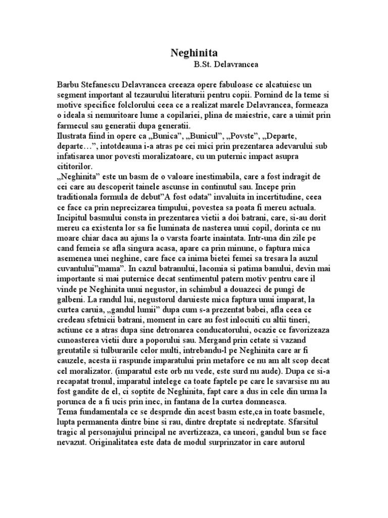 Neghiniţă Poveste De Barbu Stefănescu Delavrancea