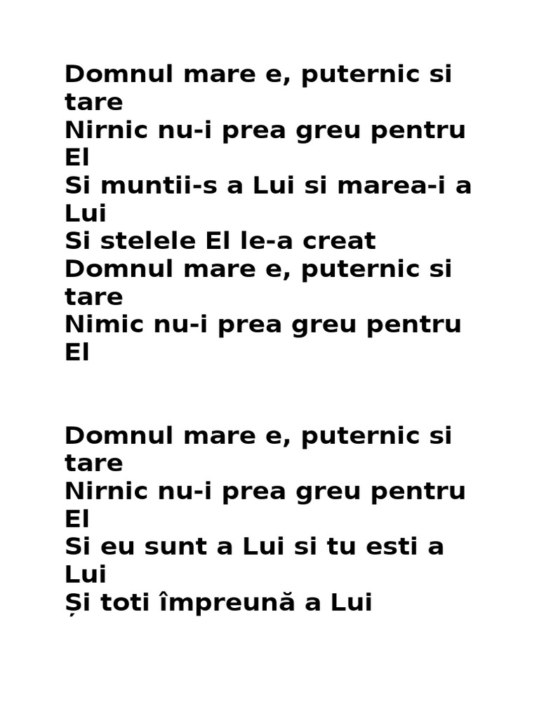 şi eu sunt al lui şi tu eşti al lui şi toţi împreună ai lui domnul mare e puternic si tare nimic nu i prea greu pentru el. Nimic nu i prea greu pentru el f m c m crezi în braţul său tare în a sa splendoare a b c m nimic nu i prea greu pentru el.