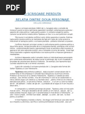 Relatia dintre 2 pers din o scrisoare pierduta. Protagonitii sunt personaje plate lipsite de profunzime. Dintre personajele cu rol important in compozitie privilegiati sunt zaharia trahanache personalitatea politica a judetului si nae catavencu avocat dornic de puetere care tulbura prin ambitia sa linistea orasului de provincie. O scrisoare pierduta de i l.