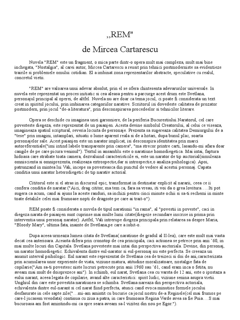 Recomandăm realizarea rezumatului operei ținând cont de structura sa și accentuând cele mai importante elemente având în vedere faptul că nuvela este o specie literară de întindere medie cu dimensiuni cuprinse între cele ale povestirii și cele ale romanului. La sfârșit există un mic paragraf care poate lumina gândurile noastre confuze. Intreaba despre referat rem de mircea cartarescu nuvela rem este un fragment o mica parte dintr o opera mult mai complexa mult mai bine inchegata nostalgia al carei autor mircea cartarescu a reusit prin tehnici postmoderniste sa evidentieze trairile si problemele omului cotidian. Mircea cartarescu rem pdf download.