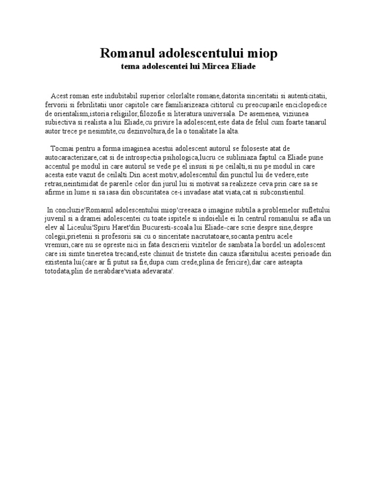 Romanul Adolescentului Miop De Mircea Eliade
