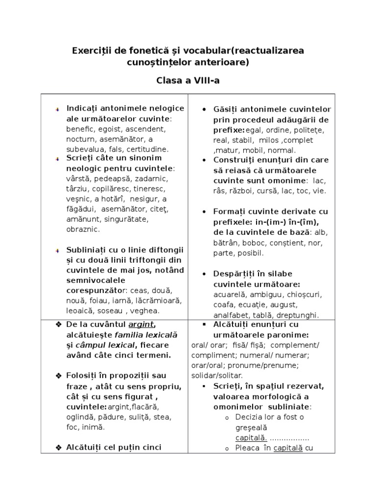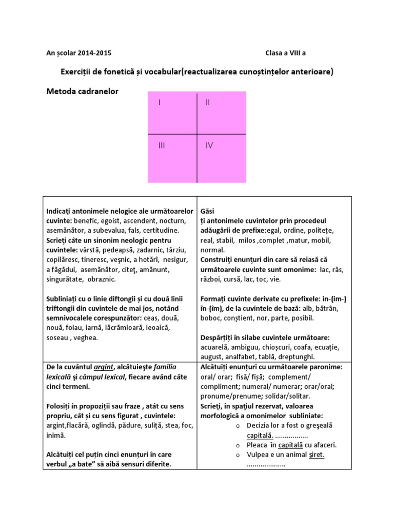 Exerciții De Fonetică și Vocabular Reactualizarea Cunoștințelor Anterioare Metoda Cadranelor